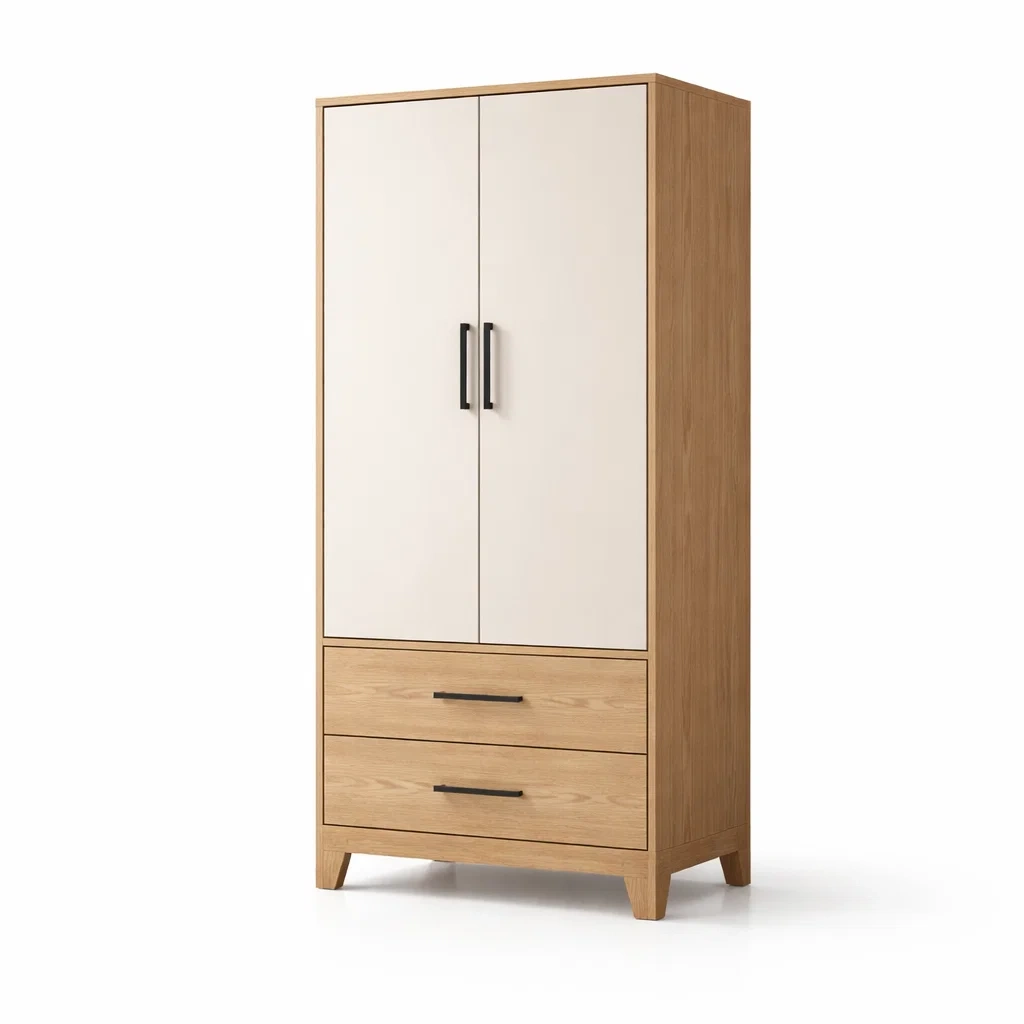 Dieser Kleiderschrank besteht aus einem Rahmen mit Eichenfurnier und MDF-Fronten in Weiß. Er bietet zwei große Türen und zwei Schubladen. Die Maße sind 180 cm Höhe, 80 cm Breite und 50 cm Tiefe. Das Gewicht des Schranks beträgt 68.5 kg.